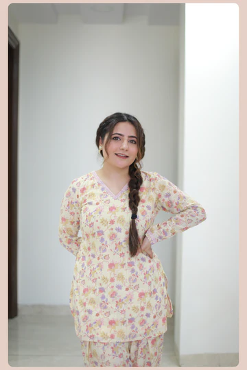Experience effortless elegance with the Gulbahaar Cotton Kurta Set, crafted from high-quality breathable cotton designed to keep you cool and confident all day. The kurta features a delicate ivory base adorned with graceful pink floral motifs and crochet lace detailing along the V-neck and sleeves evoking homegrown artisanal charm.